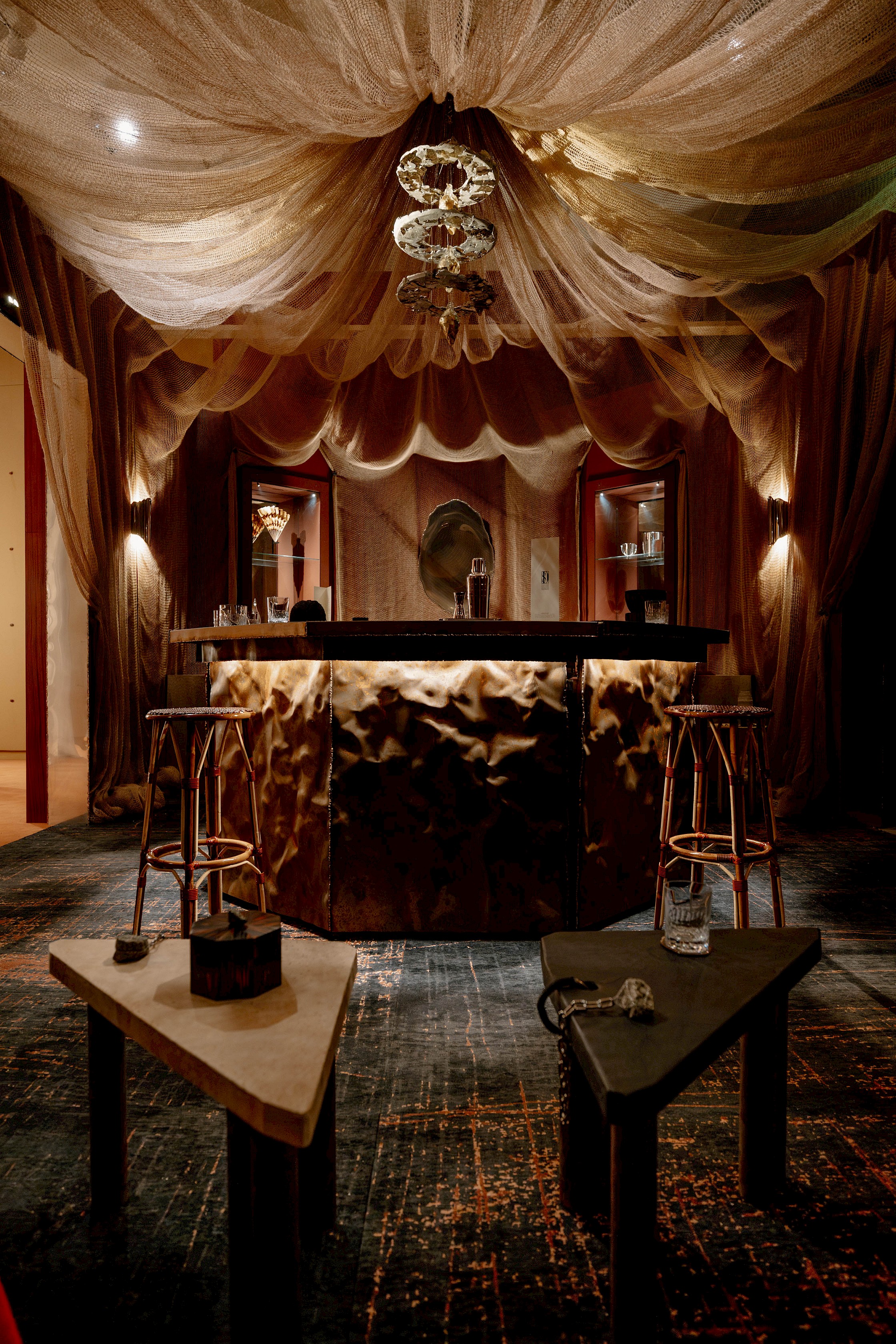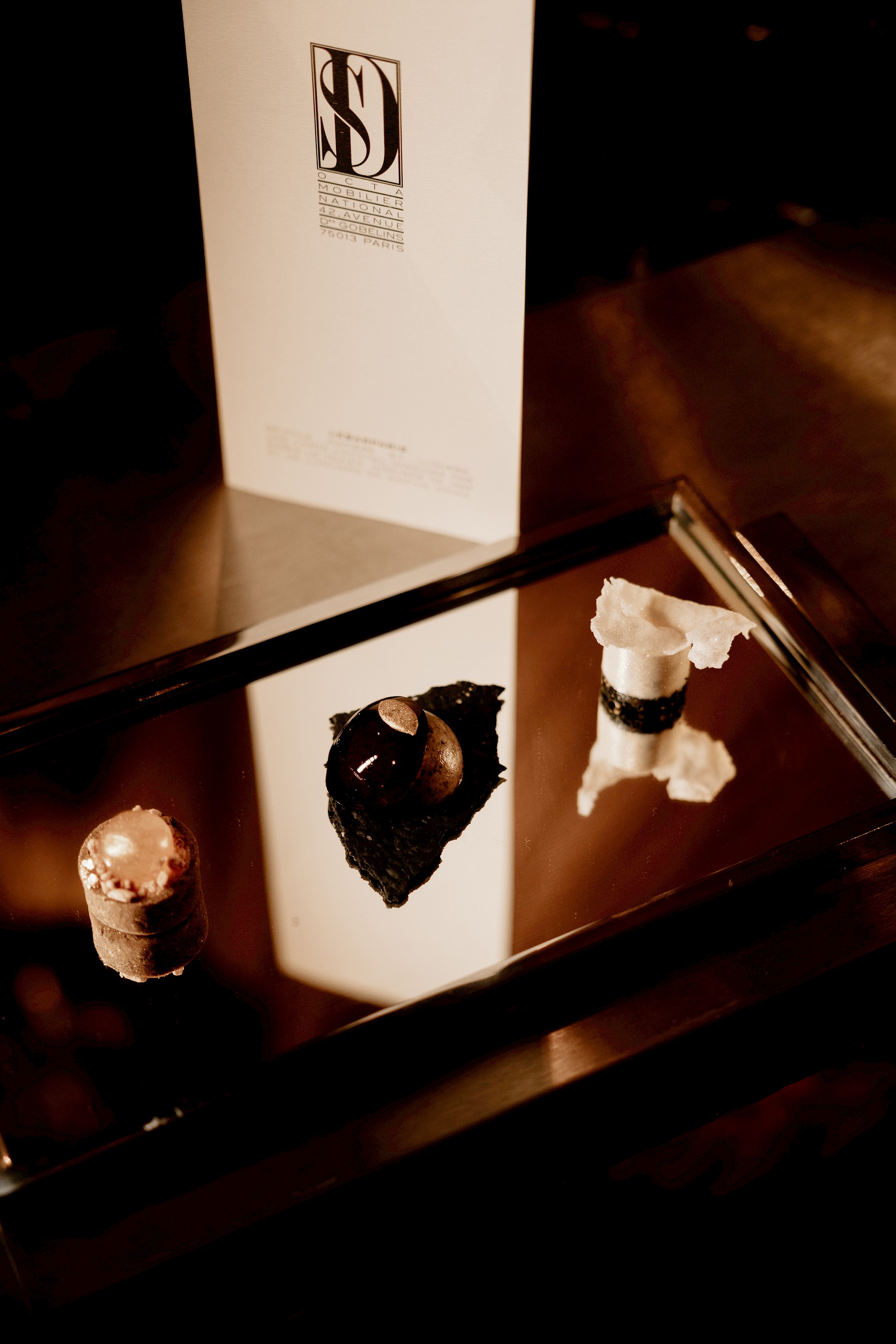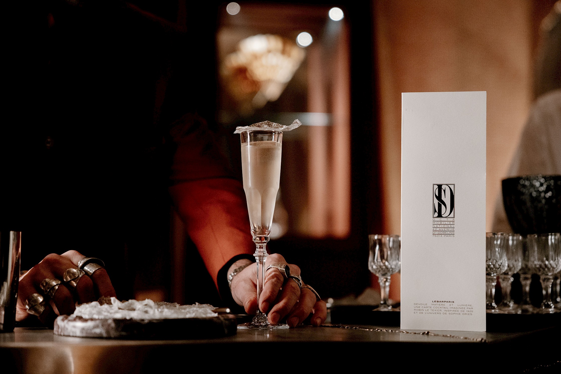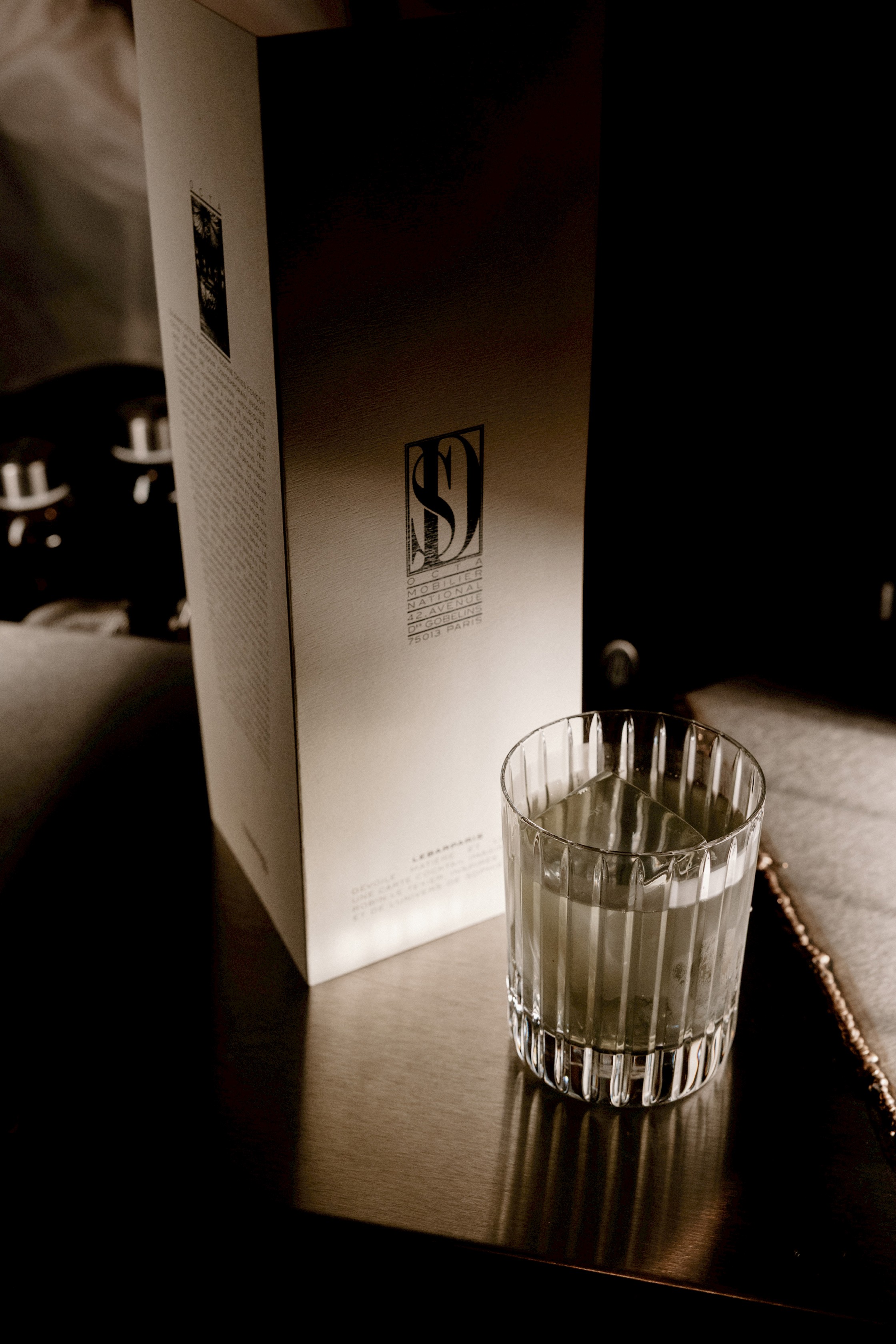 Expérience immersive - Collaboration avec la designer Sophie Dries, autour de son œuvre architecturale, le bar Octa, exposée au Salon des Nouveaux Ensembliers au Mobilier National. Création de la carte cocktail sur-mesure "Matière et Lumière", qui rend hommage à l'esprit 1925 et au travail de l'artiste.